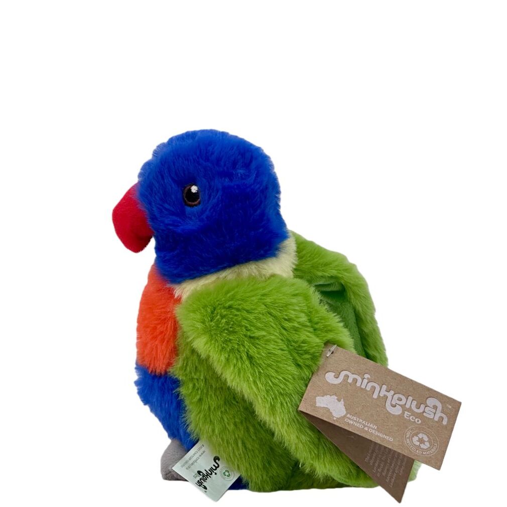 Hello, I am Larry the Lorikeet from the Minkplush range.The Lorikeet is a colourful and vibrant species of parrot. The Lorikeet is social, generally living in flocks. They forage for flowers on shrubs or trees to harvest nectar and pollen. Lorikeets also eat seeds, fruit, and some insects.This plush toy is made from 100% recycled materials including fabric, stuffing, thread, eyes, and polyester beads.