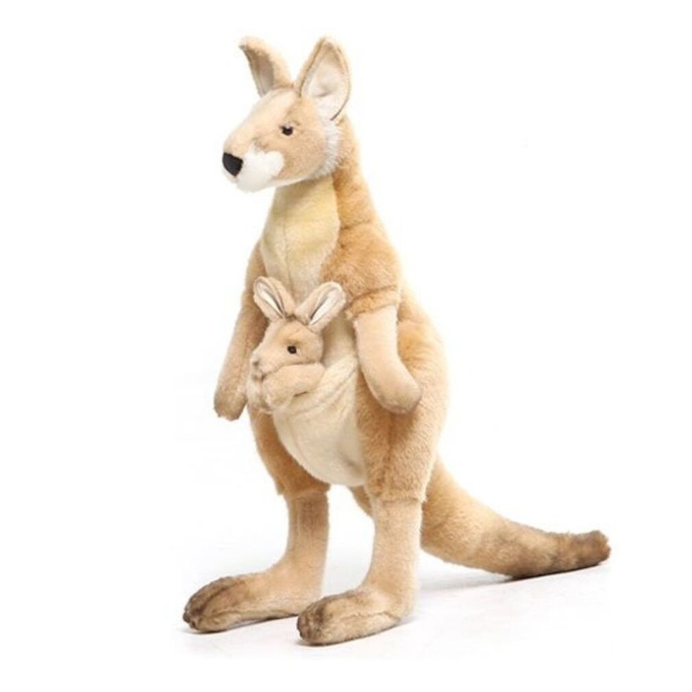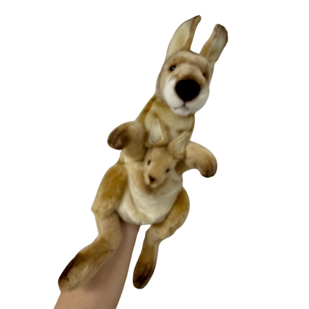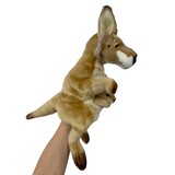 RED KANGAROO & JOEY HAND PUPPET SOFT PLUSH TOY - HANSA Red Kangaroo & Joey hand puppet by Hansa Toys. This Red Kangaroo & Joey puppet is extremely lifelike and of exceptional quality, the facial details are amazing - you won't be disappointed. Perfect for schools.  Hansa Toys stand apart from the competition because of the quality, attention to detail, and pin point accuracy of specific animal characteristics that are used in each production. Artists create each Hansa animal from portraits of the creature in its natural habitat. Hansa meticulously hand-cuts and trims the coats of each animal, never by machine, and they get specially trained Hansa artisans to create the subtle coloring on the animals by hand painting or airbrushing. On average, there are 42 separate pieces required to make each animal. (Some animals have as many as 240 different parts!
